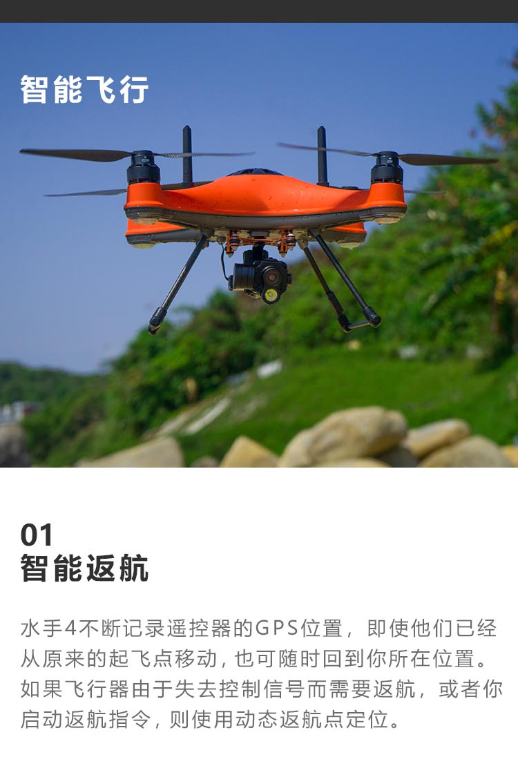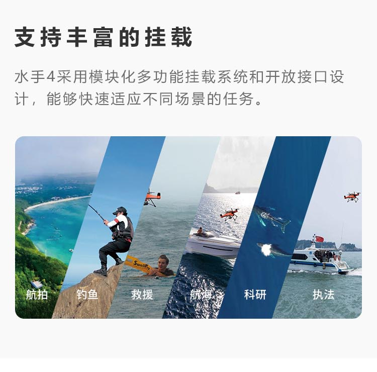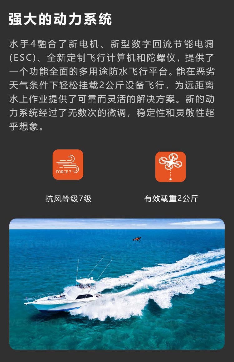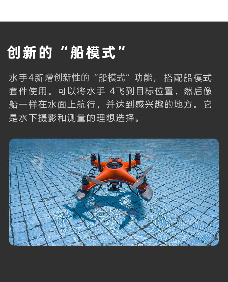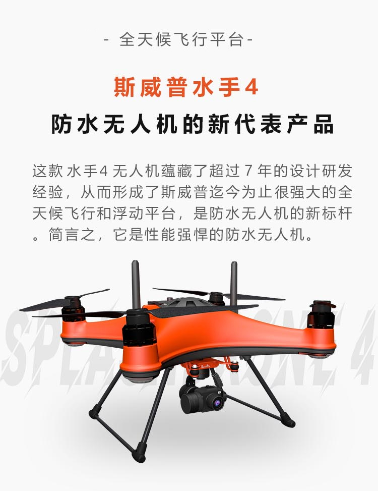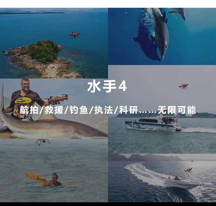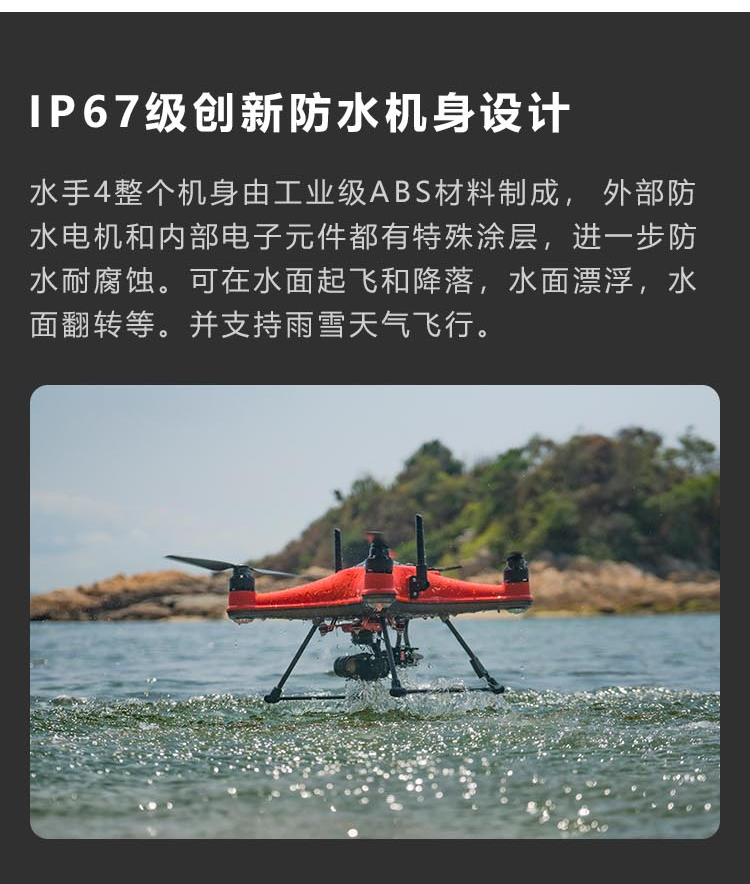 水手4無人機(SplashDrone 4)是一款全新的防水飛行和水上漂浮平臺,專門設(shè)計用于在各種惡劣環(huán)境中多功能作業(yè)。水手4是迄今為止優(yōu)秀的防水無人機之一。采用模塊化防水配件,如4K相機或投放裝置,可以根據(jù)用戶需求自行搭配。水手4用途廣泛,可用于航拍,釣魚,救援和科研等領(lǐng)域。是一個多功能、全天候的防水飛行平臺。