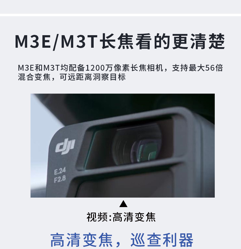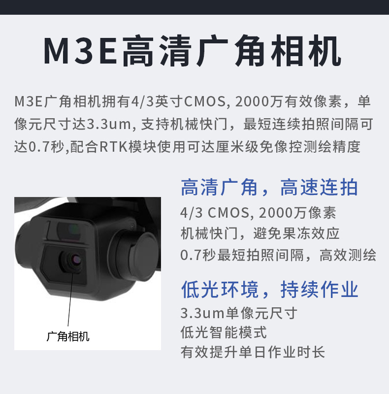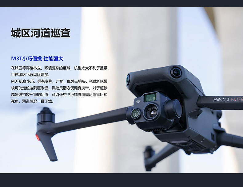 Mavic3 行業(yè)系列是兩款小型行業(yè)無人機,具有小巧便攜和強大性能的特點。 其中,Mavic3E主要針對測繪和泛測繪領(lǐng)域,配備了 4/3 英寸廣角相機和機械快門,結(jié)合RTK 模塊可以實現(xiàn)高精度測繪作業(yè)。 Mavic3T則主要針對消防、巡邏和搜救等場景,配備了廣角長焦和熱紅外相機。