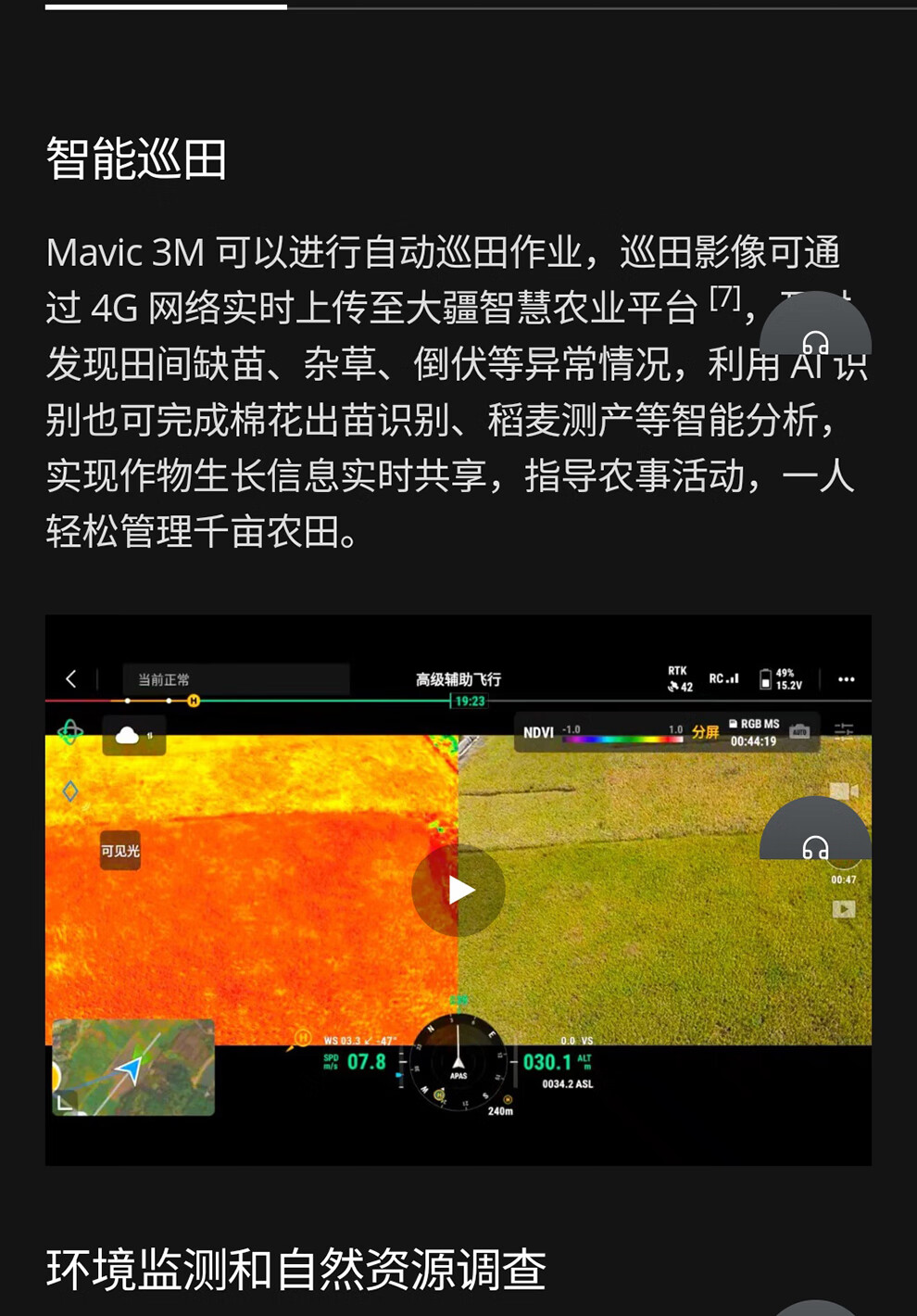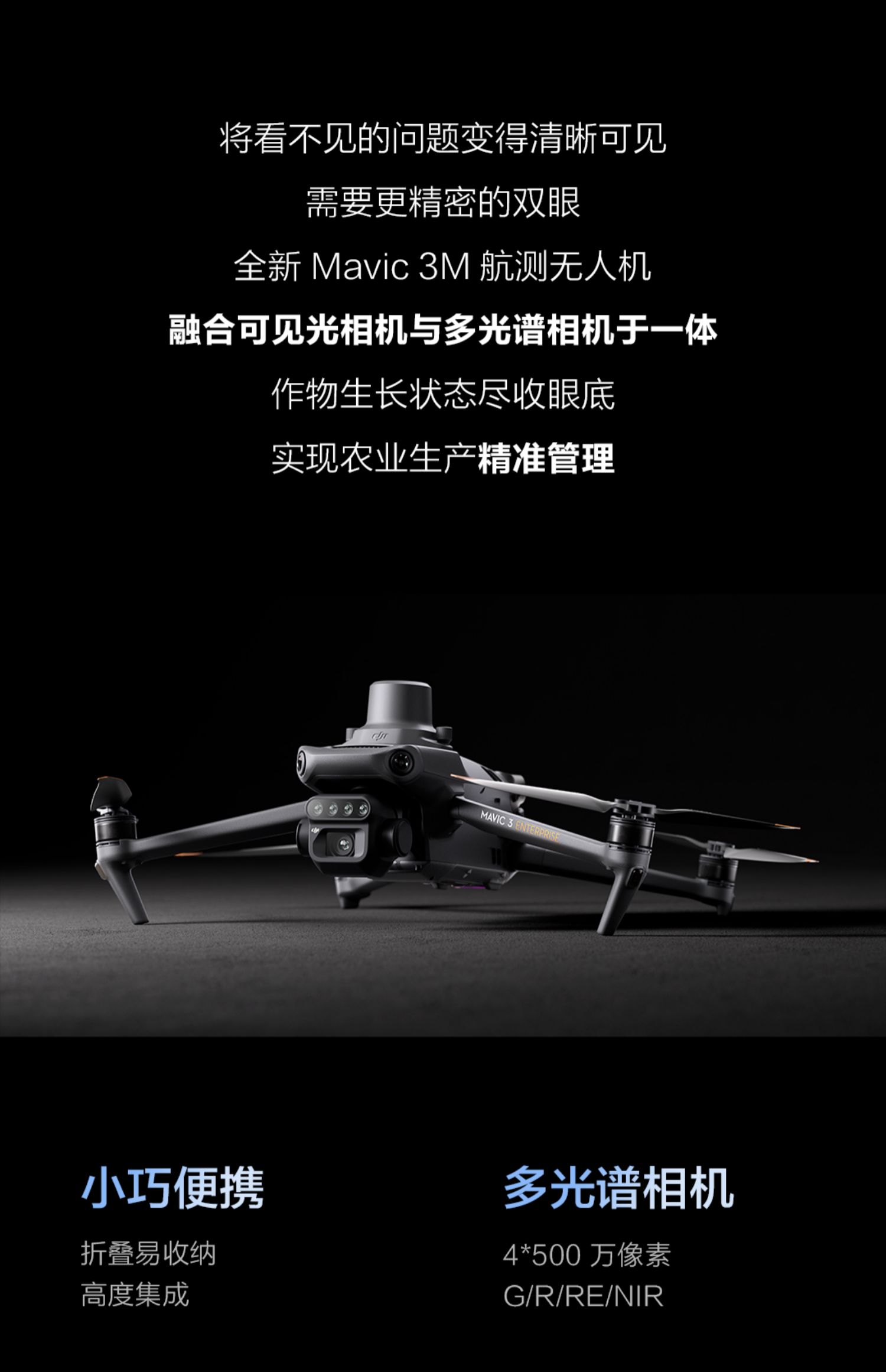 大疆御Mavic 3多光譜版無人機(jī)融合可見光相機(jī)與多光譜相機(jī)于一體,作物生長狀態(tài)盡收眼底,實(shí)現(xiàn)農(nóng)業(yè)生產(chǎn)精準(zhǔn)管理。全新升級(jí)的影像系統(tǒng),集成了 1 個(gè) 2000 萬像素可見光相機(jī)及 4 個(gè) 500 萬像素的多光譜相機(jī)(綠光,紅光,紅邊和近紅外)??蓪?shí)現(xiàn)高精度航測(cè)、作物生長監(jiān)測(cè)、自然資源調(diào)查等 應(yīng)用。機(jī)身集成多光譜光強(qiáng)傳感器可采集太陽輻照度并記錄于影像文件中,可在二維重建過程對(duì)影像數(shù)據(jù)進(jìn)行光照補(bǔ)償,獲得更準(zhǔn)確的 NDVI 結(jié)果,提高不同時(shí)段采集到的數(shù)據(jù)的準(zhǔn)確度與 一致性。