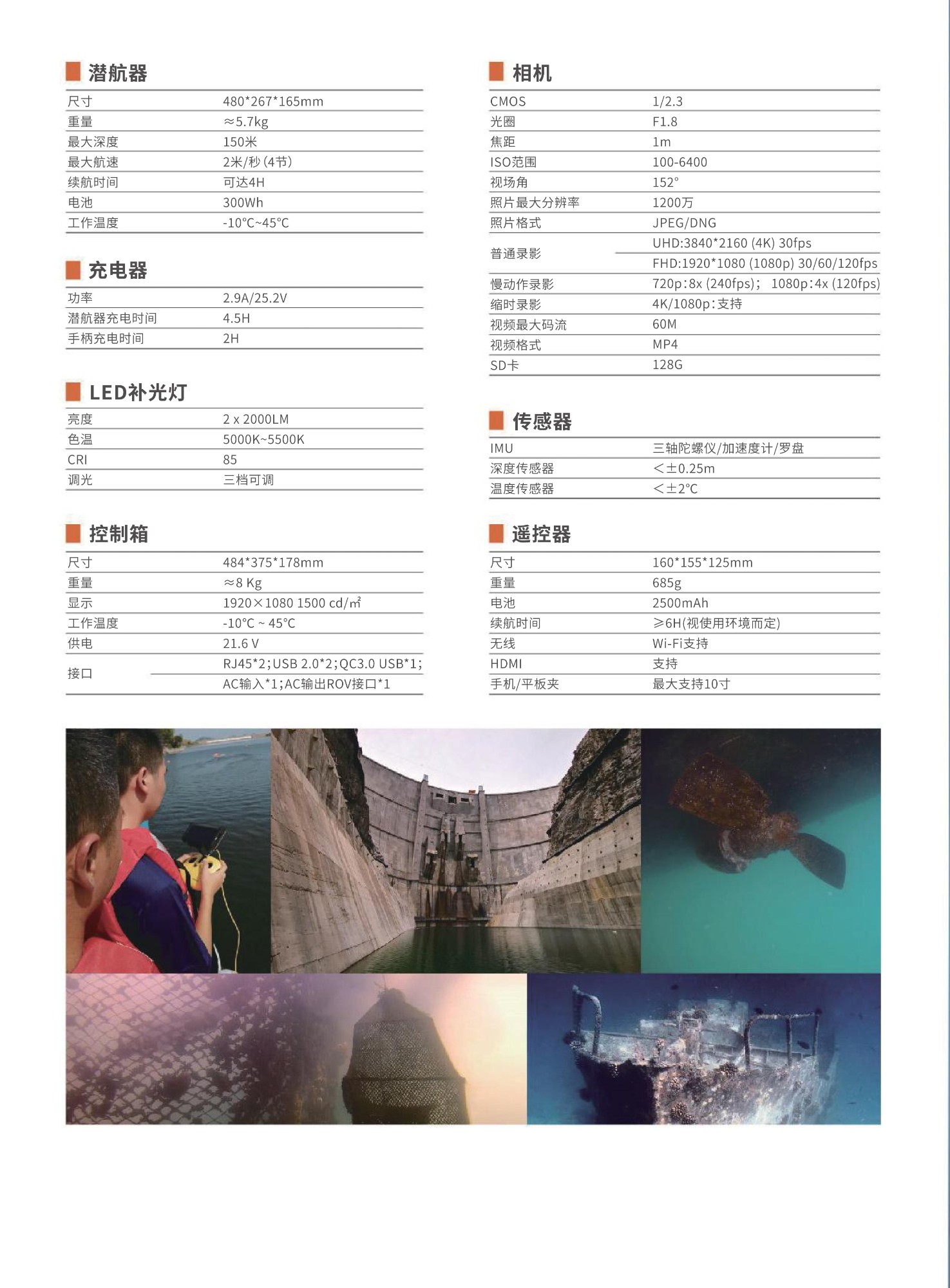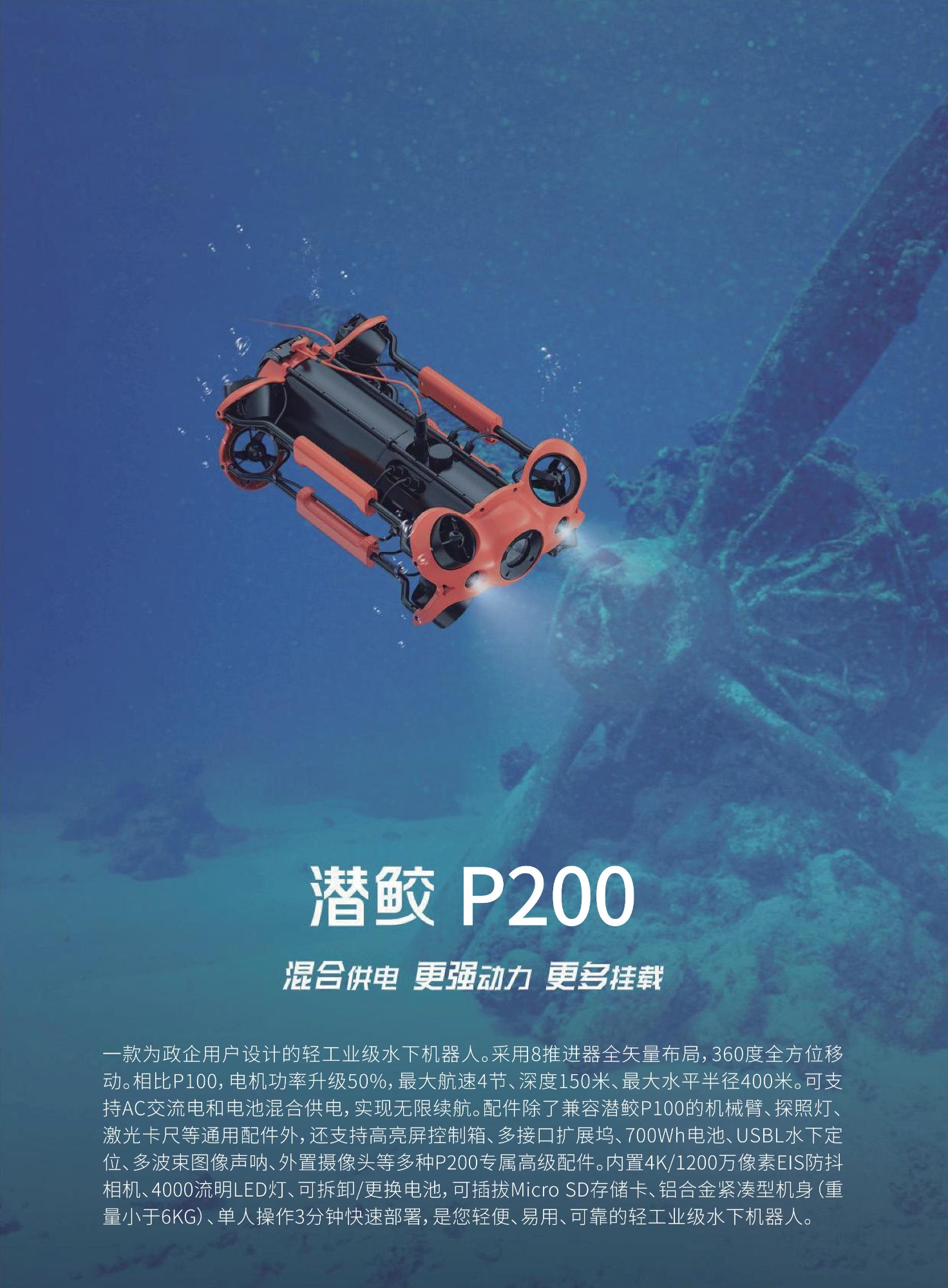 一款為政企用戶設(shè)計的輕工業(yè)級水下機器人。采用8推進器全矢量布局,360度全方位移動。相比P100,電機功率升級50%,最大航速4節(jié)、深度150米、最大水平半徑400米??芍С諥C交流電和電池混合供電,實現(xiàn)無限續(xù)航。配件除了兼容潛皎P100的機械臂、探照燈、激光卡尺等通用配件外,還支持高亮屏控制箱、多接口擴展塢、700Wh電池、USBL水下定位、多波束圖像聲吶、外置攝像頭等多種P200專屬高級配件。內(nèi)置4K/1200萬像素EIS防抖相機、4000流明LED燈、可拆卸/更換電池,可插拔Micro SD存儲卡、鋁合金緊湊型機身(重量小于6KG)、單人操作3分鐘快速部署,是您輕便、易用、可靠的輕工業(yè)級水下機器人。