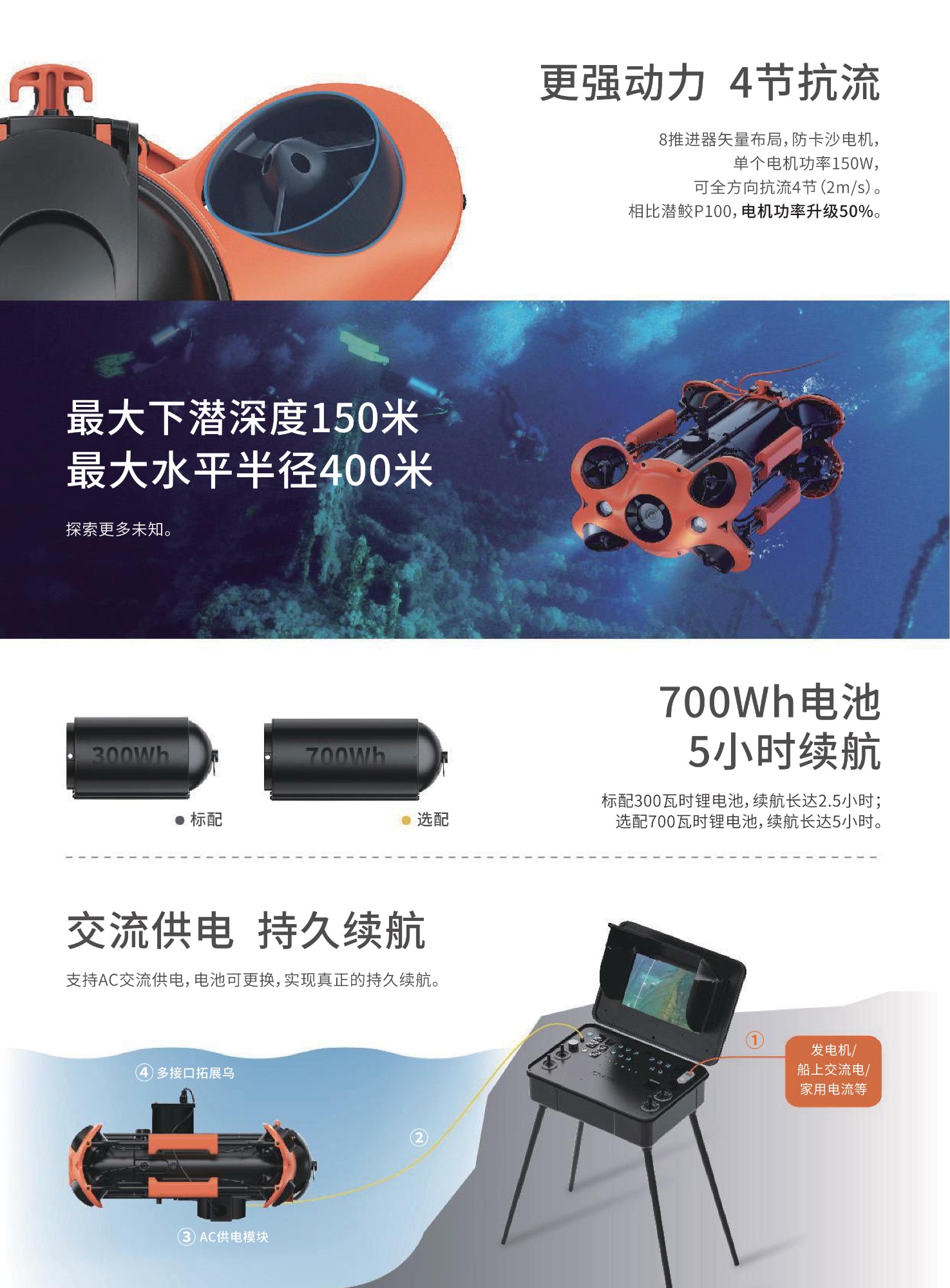 ?混合供電,實現(xiàn)持續(xù)續(xù)航。潛鮫P200支持AC交流電和電池混合供電。標(biāo)配300瓦時大容量可更換鋰電池,可選配700瓦時鋰電池,最大續(xù)航5小時,選配外接交流電設(shè)備可長時間持續(xù)續(xù)航。