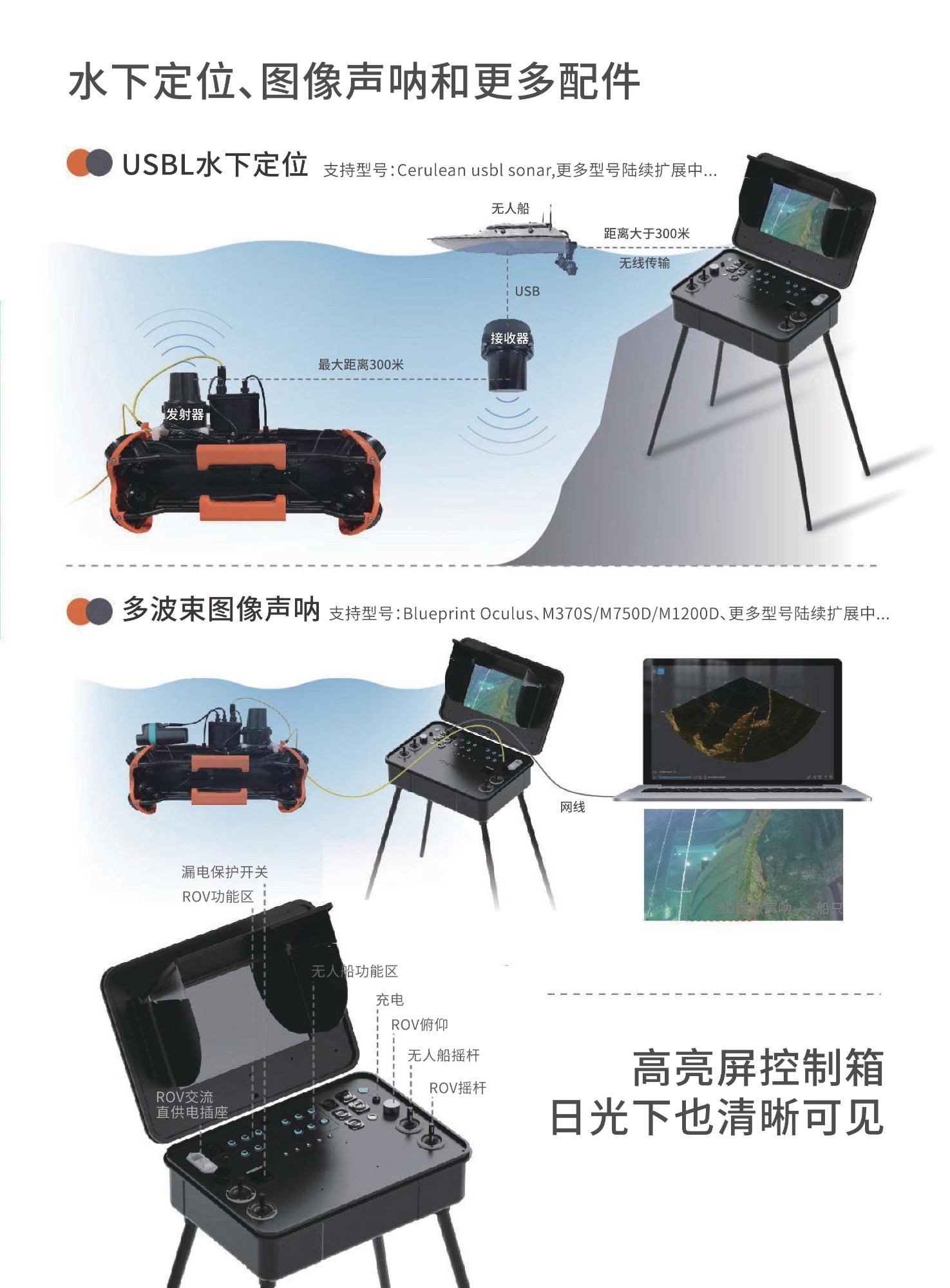 ?豐富專屬掛載,滿足更多專業(yè)場景。潛鮫P200兼容潛鮫P100的機械臂、探照燈、激光卡尺等通用配件外,還支持高亮屏控制箱、多接口擴展塢、USBL水下定位、多波束圖像聲吶、外置攝像頭等多種P200專屬高級配件。